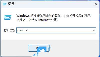 2、運行窗口,輸入【control】命令,然后按【確定或回車】打開控制面板;