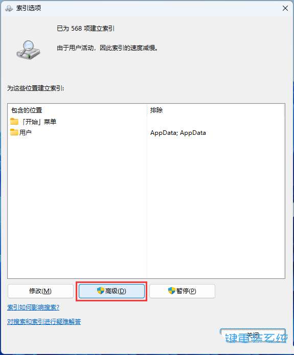4、索引選項窗口,點擊底下的【高級】;