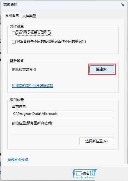 5、高級選項窗口,索引設置選項卡下,點擊刪除和重建索引旁的【重建】;