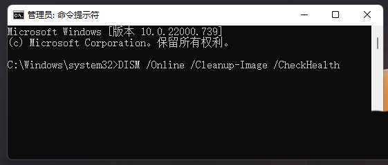 命令提示符中,輸入并按回車執行【DISM /Online /Cleanup-Image /CheckHealth】命令,該命令可以用來修復Windows系統鏡像、安裝程序、恢復程序和PE系統