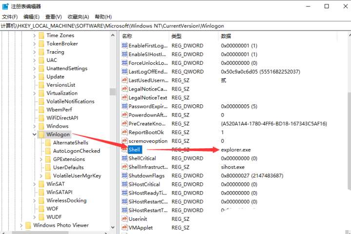 4、左側點擊【Winlogon】,右側點擊【Shell】。雙擊Shell,如果Shell的數值數據為【explorer.exe】,則是正確的,如果不是 explorer.exe ,則把Shell的數值數據,更改為 explorer.exe ,最后,點擊【確定保存】,并重啟電腦就可以了;