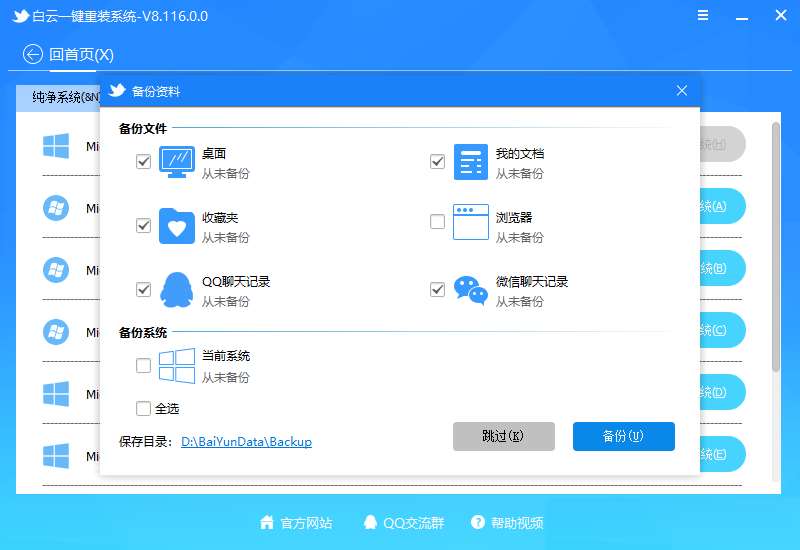 4、點(diǎn)擊安裝原版的Win10系統(tǒng)后,會(huì)提示是否備份資料,備份文件支持【桌面/我的文檔/收藏夾/瀏覽器/QQ聊天記錄/微信聊天記錄】,以及備份【當(dāng)前系統(tǒng)】,如果不需要備份,直接點(diǎn)擊【跳過(guò)】即可;