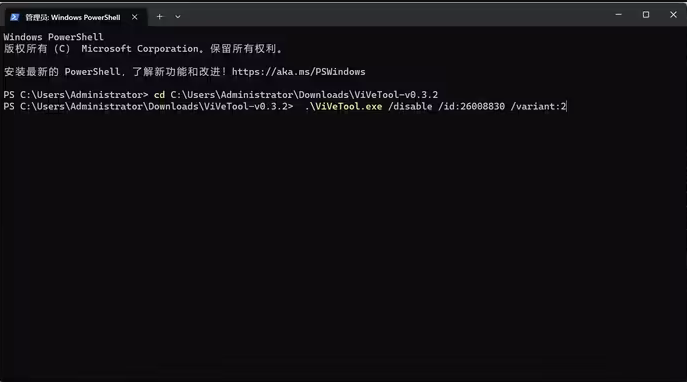 4、再輸入 \ViVeTool.exe /disable /id:26008830 /variant:2;