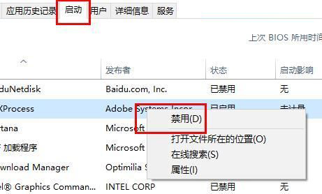 6、點(diǎn)擊頂部”啟動(dòng)”,右擊“狀態(tài)”顯示為“已啟動(dòng)”的項(xiàng),選擇“禁用”。
