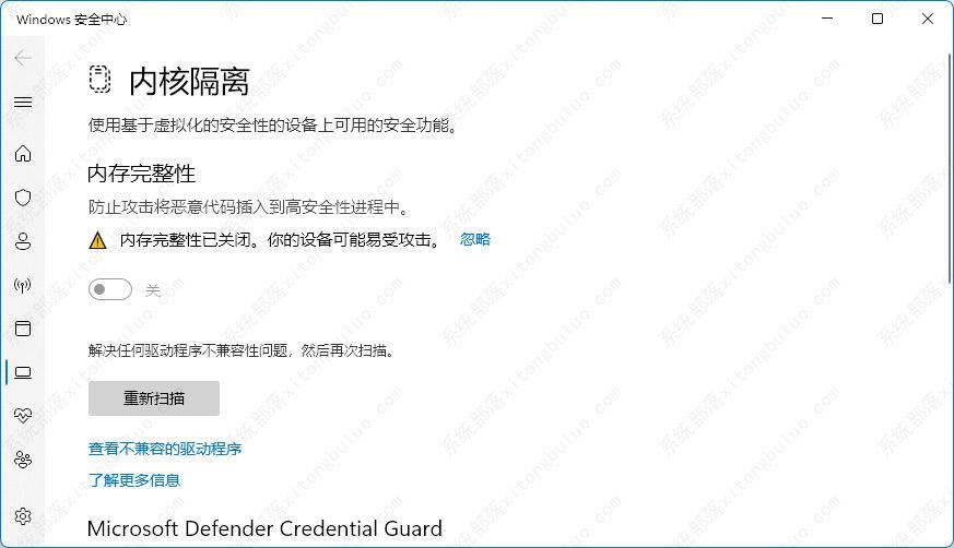 4、刪除后再重新打開Windows安全中心>設備安全性>內核隔離,重新掃描檢測無不兼容問題后開啟內存完整性。電腦提示重啟后再開機,內存完整性就可以正常開啟。