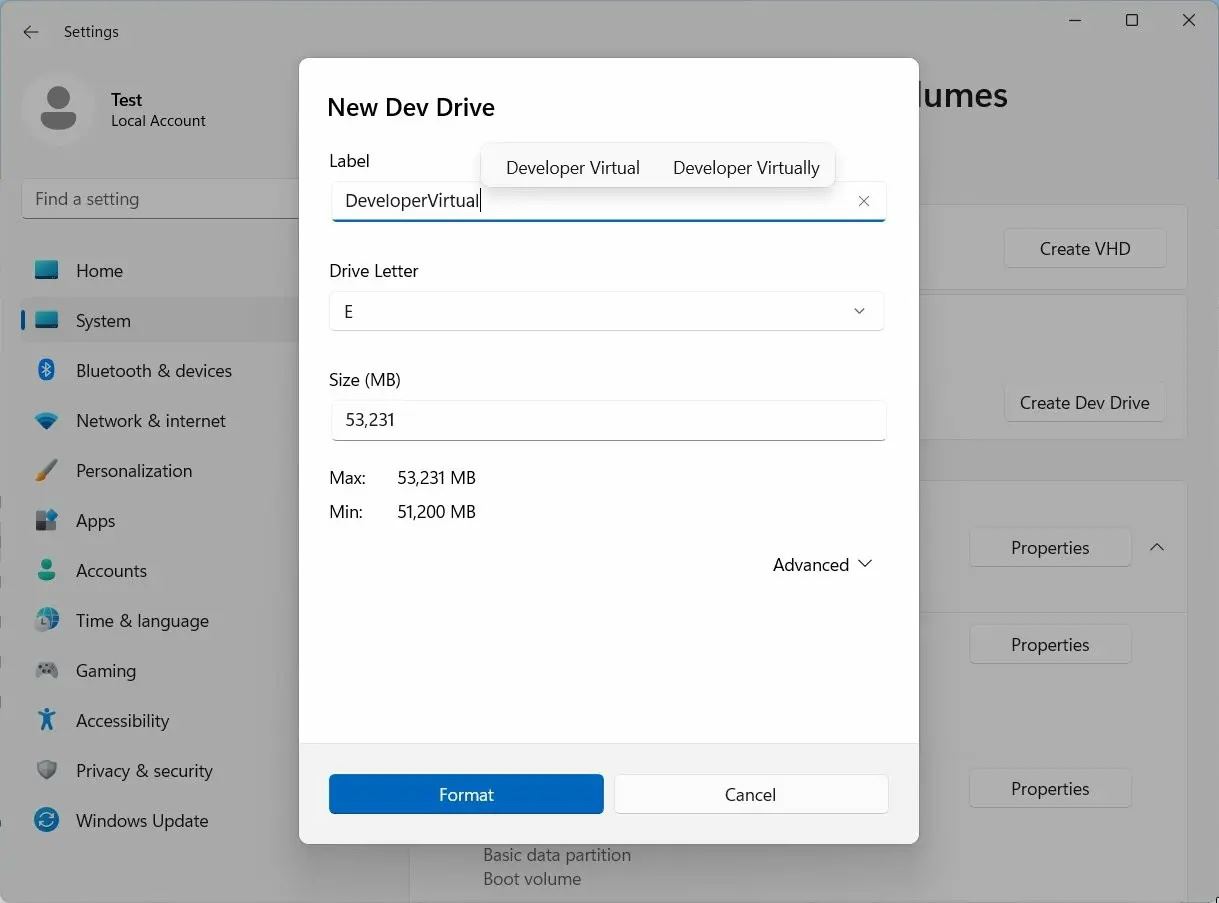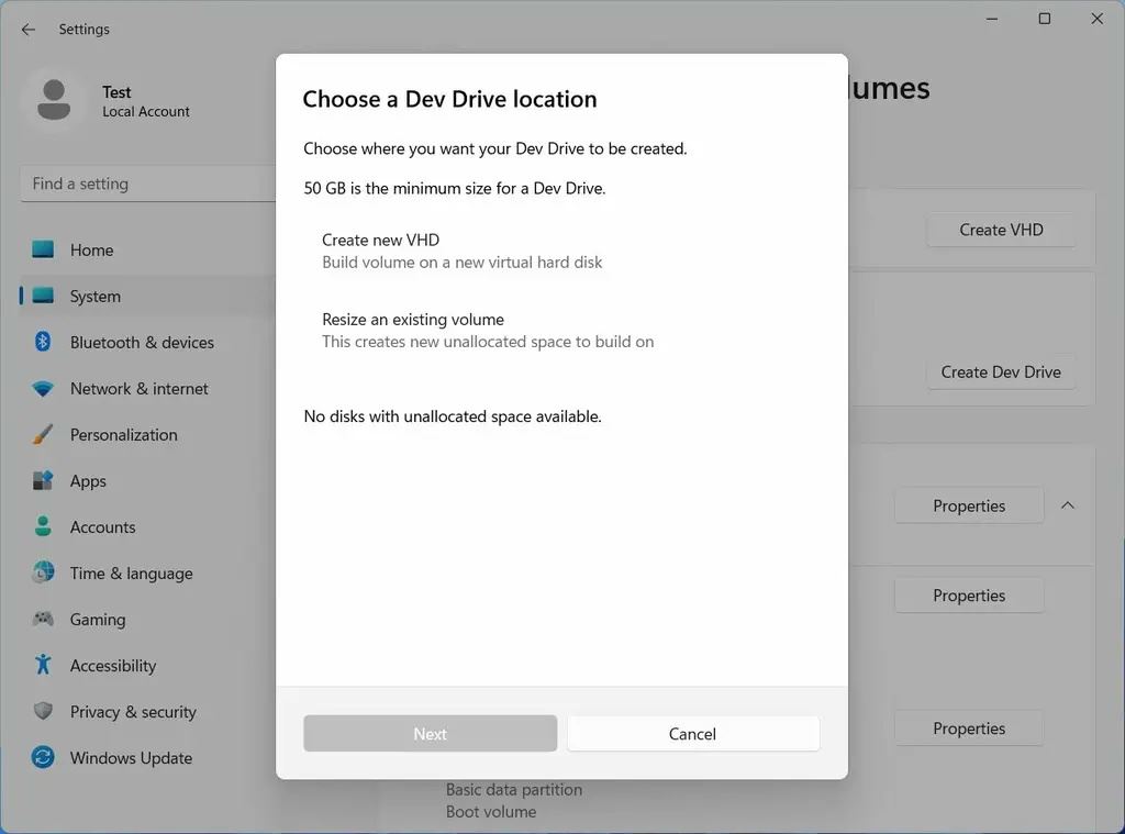 下面四張圖展示了創建虛擬硬盤的步驟。首先是直觀的“創建開發驅動器”選項(最小 50GB),然后是驅動器的位置、創建 VHD 窗口,最后是格式化新創建的 VHD 的選項 Dev Drive。