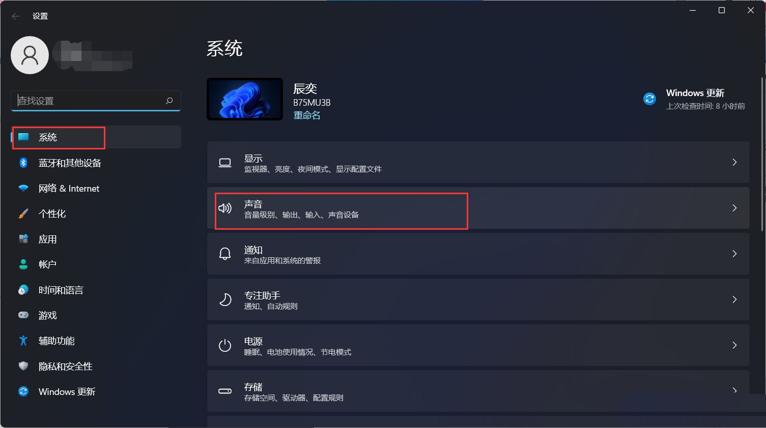 2、設置窗口,左側邊欄點擊【系統(tǒng)】,右側點擊【聲音(音量級別、輸出、輸入、聲音設備)】;