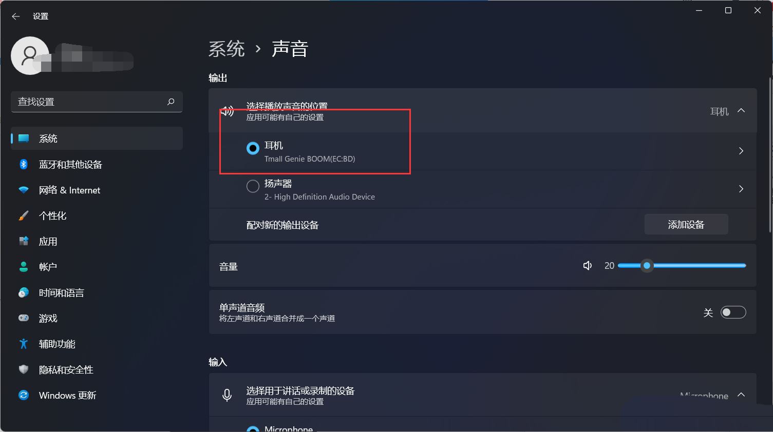 3、當前路徑為:系統(tǒng) > 聲音,輸出下,選擇【耳機】;