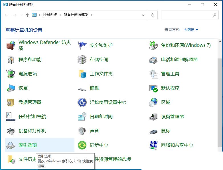 2、所有控制面板項(xiàng)窗口,切換到【大圖標(biāo)】查看方式,調(diào)整計(jì)算機(jī)的設(shè)置下,找到并點(diǎn)擊【索引選項(xiàng)(更改 Windows 索引方式以加快搜索速度)】;