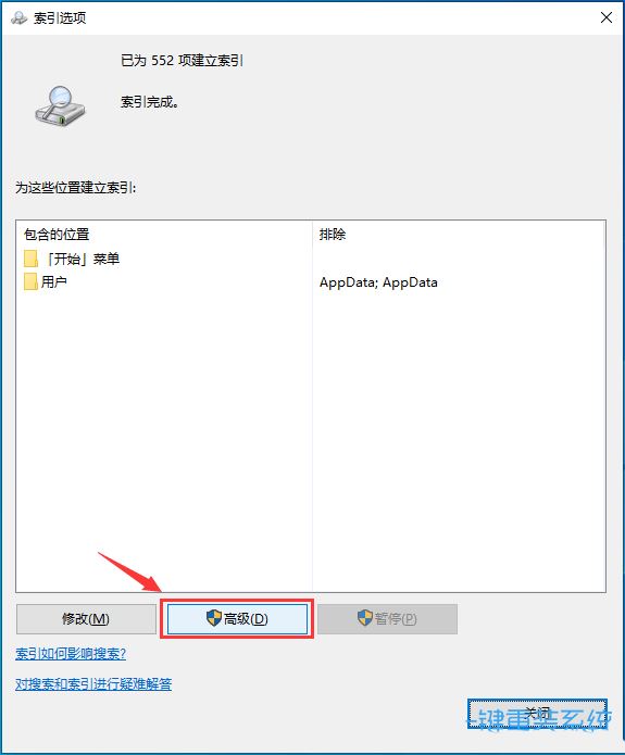 3、索引選項(xiàng)窗口,點(diǎn)擊底下的【高級(jí)】;