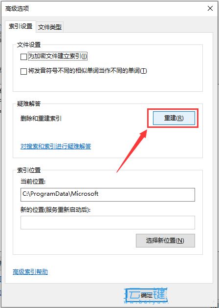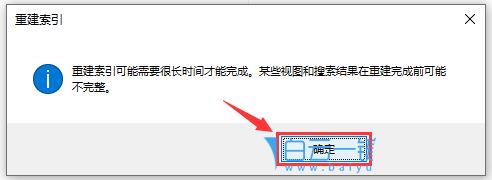 5、重建索引提示框,重建索引可能需要很長時(shí)間才能完成。某些視圖和搜索結(jié)果在重建完成前可能不完整。點(diǎn)擊【確定】;