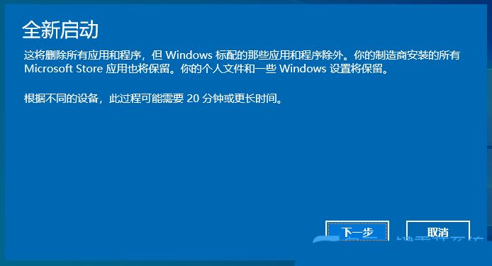 2、全新啟動(dòng),這將刪除所有應(yīng)用和程序,但 Windows 標(biāo)配的那些應(yīng)用和程序除外。你的制造商安裝的所有 Microsoft Store 應(yīng)用也將保留。你的個(gè)人文件和一些 Windows 設(shè)置將保留;