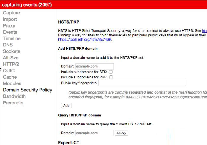 3、然后我們在瀏覽器輸入“chrome://net-internals/#hsts”指向?yàn)g覽器參數(shù)設(shè)置界面,有些瀏覽器可能不支持這個(gè)頁面,我們可以使用谷歌瀏覽器打開。