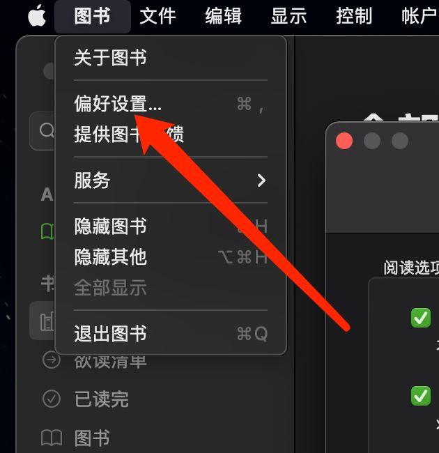 打開Mac版圖書的偏好設置,點擊閱讀。