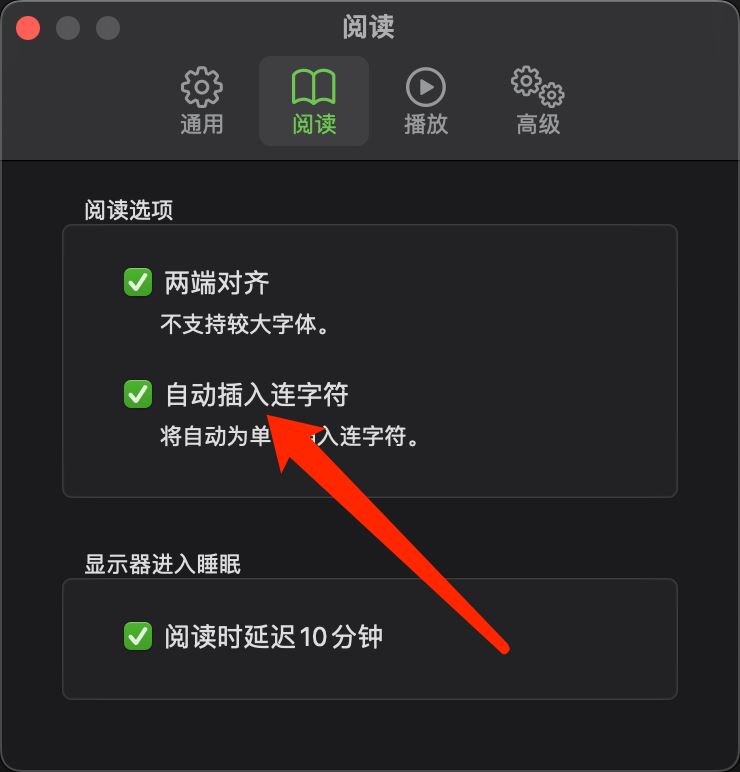 打開Mac系統圖書的閱讀設置頁面,可設置自動插入連字符。操作步驟如下: