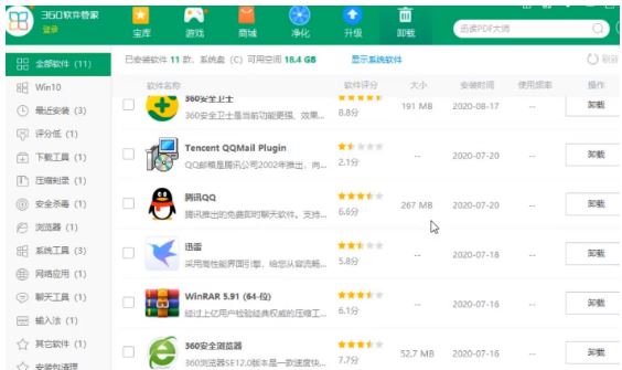 2、打開“360軟件管家”,點擊上方的卸載,自動掃描軟件后,全部軟件將呈現出來。