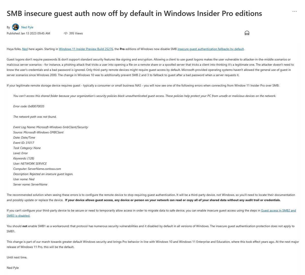 微軟官方技術(shù)博客近日更新了一篇博文,微軟首席項(xiàng)目經(jīng)理 Ned Pyle 表示 Win11 專業(yè)版即將默認(rèn)禁用 SMB 來賓認(rèn)證服務(wù),認(rèn)為這項(xiàng)服務(wù)存在諸多不安全的地方。
