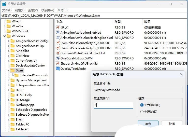6、最后,雙擊【OverlayTestMode】,在彈出編輯DWORD (32 位)值窗口中,將數(shù)值數(shù)據(jù)修改為【5】;