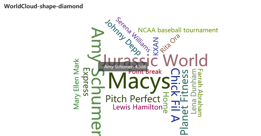 - 詞云圖from pyecharts.charts import WordClouddef word1(): words= [ ('Sam S Club', 10000), ('Macys', 6181), ('Amy Schumer', 4386), ('Jurassic ...