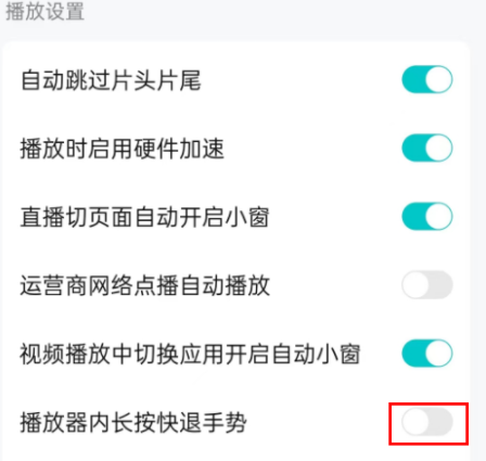 3、然后我們需要找到播放設置中的長按快退手勢,開啟或者關閉右側開關即可。