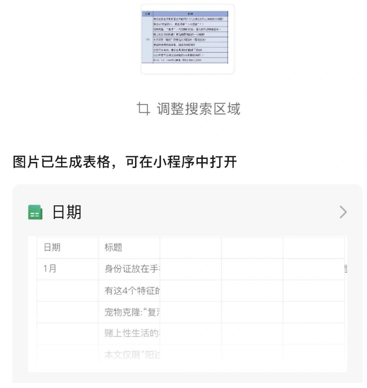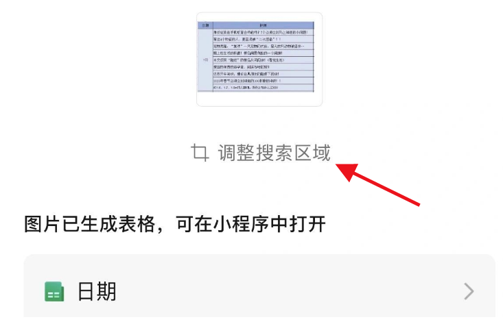 4、可以調整轉換為電子表格的區域,也可以在小程序中找到該電子表格。