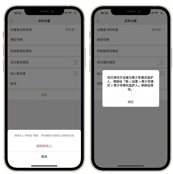 操作完成后,關閉青少年模式。當對方想要拉黑或刪除你的時候,就會彈出禁止操作的提示了。