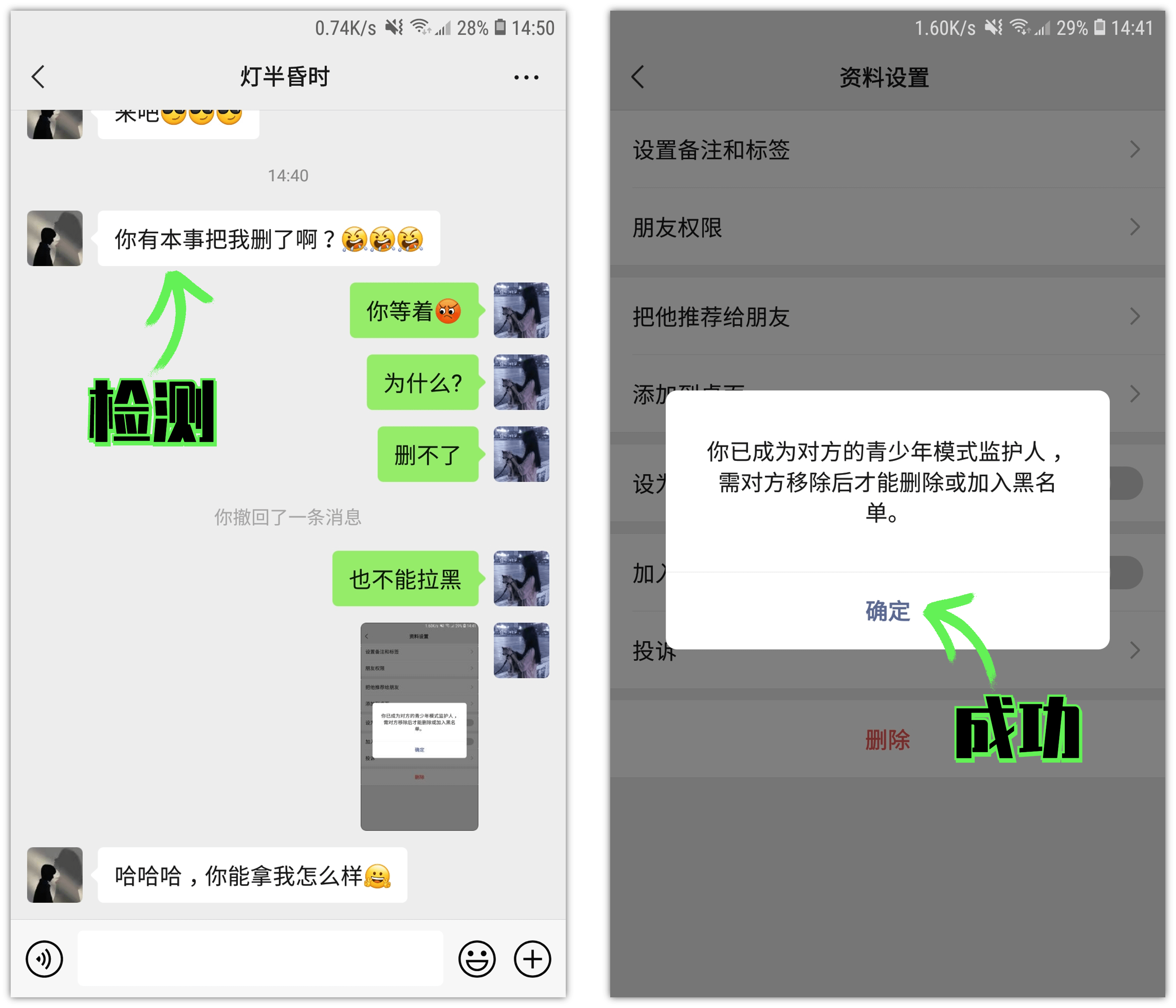 下面來進行測試,讓對方刪除或者拉黑你,無論如何都無法成功。同理,你也不能將對方拉黑刪除,雙方成為永遠的好友!
