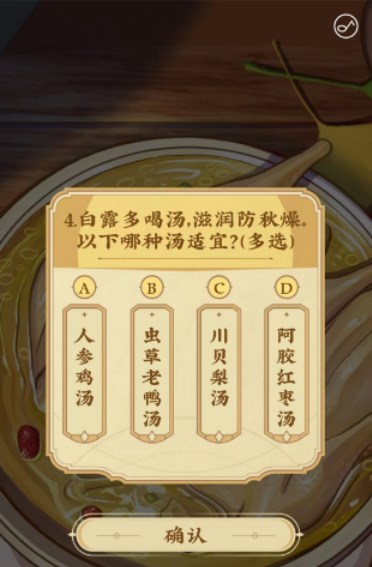 4、白露多喝湯,滋潤防秋燥。以下哪種湯適宜?【答案:ABCD】