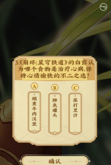 3、崩壞星穹鐵道的白露認為哪個食物是治療心病,保持心情愉快的不二之選?【答案:A煙熏牛肉漢堡】