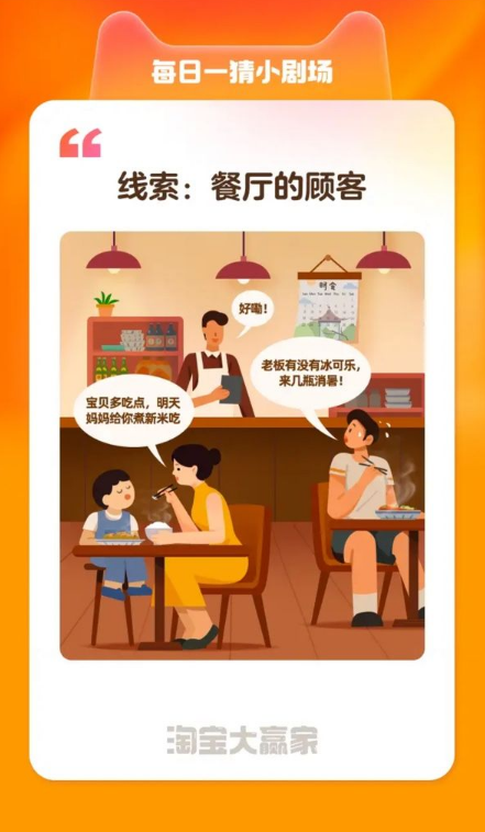 今天的題目是由每日一猜自己提供的,通過每日一猜“進(jìn)來找線索”進(jìn)入每日一猜小劇場后,我們可以發(fā)現(xiàn)一張線索圖,線索是“餐廳的顧客”,關(guān)鍵詞是顧客的對話。