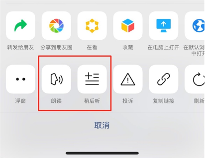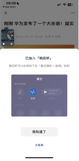 3、)如果用戶暫時不方便聽,還可以將文章加入"稍后聽"列表,在"微信界面下拉"的"最近播放"中的音頻中找到該文章。