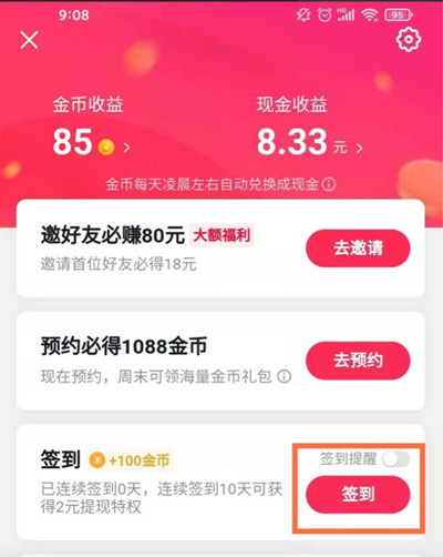 在來賺錢的頁面中,用戶可以通過關閉右側簽到提醒的小滑塊,即可關閉極速版簽到領金幣的提醒。
